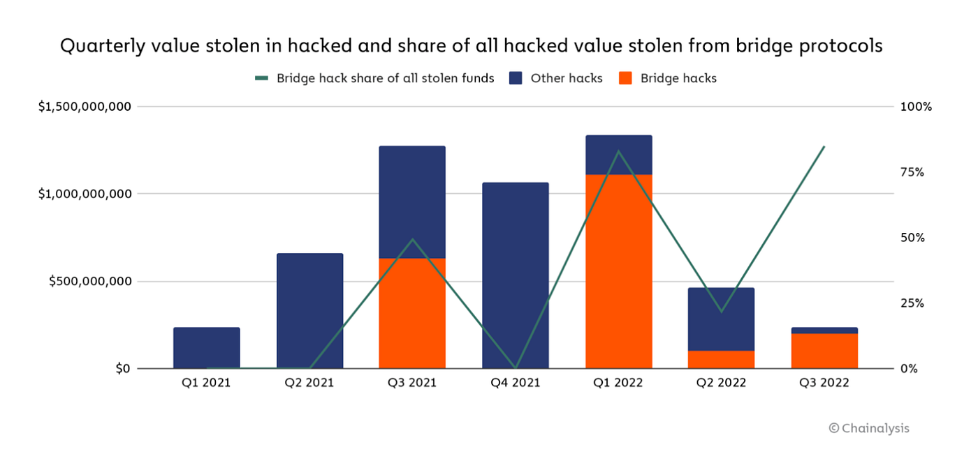 Cross-chain bridges are tricky. A major challenge is ensuring the security of the bridge, protecting the assets stored in the smart contracts or centralized custodian. Bridges have historically been an attractive target for hackers due to the central storage of funds that back the bridged assets. The ever-evolving designs of bridges also makes it possible for attackers to find new loopholes and bugs to exploit. Wormhole was hacked for $325 million in 2022 after a security fix was uploaded to Github but not before the hacker managed to make off with the funds. Chainalysis reported cross-chain bridge attacks were responsible for 69% of total stolen funds in 2022.