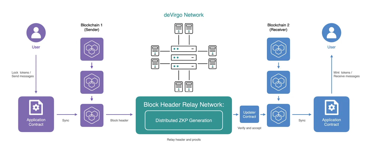 - Block header relay network: This component fetches block headers from the sender chain, generates proofs to authenticate the headers, and then transmits both the headers and the proofs to the updater contract on the receiver chain.