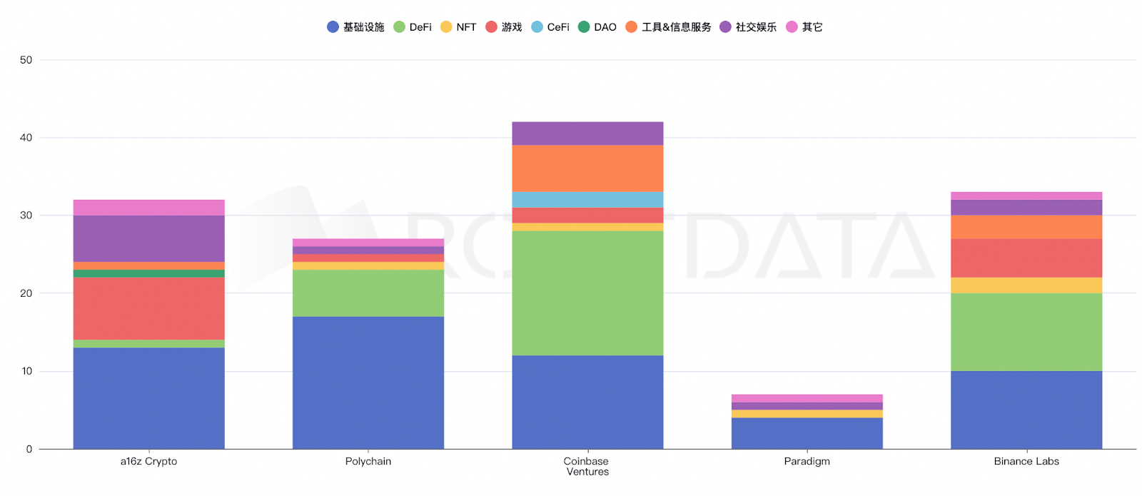 From the above figure, we can see that the infrastructure accounts for a lot of the institutions’ investment. Besides infrastructure, a16z attaches great importance to the game area; Polychain, Coinbase Ventures, and Binance Labs also focus on DeFi; Paradigm has fewer investments, and the number of its investments in other fields is relatively average.