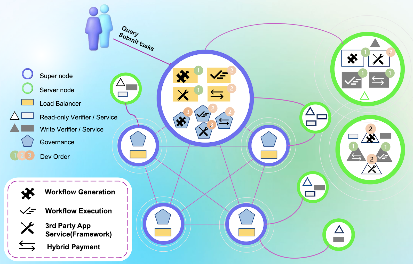 - The Supernode: Accepts the user's delegated orders and assigns them to server nodes, supervises completion, and provides rewards and punishments.