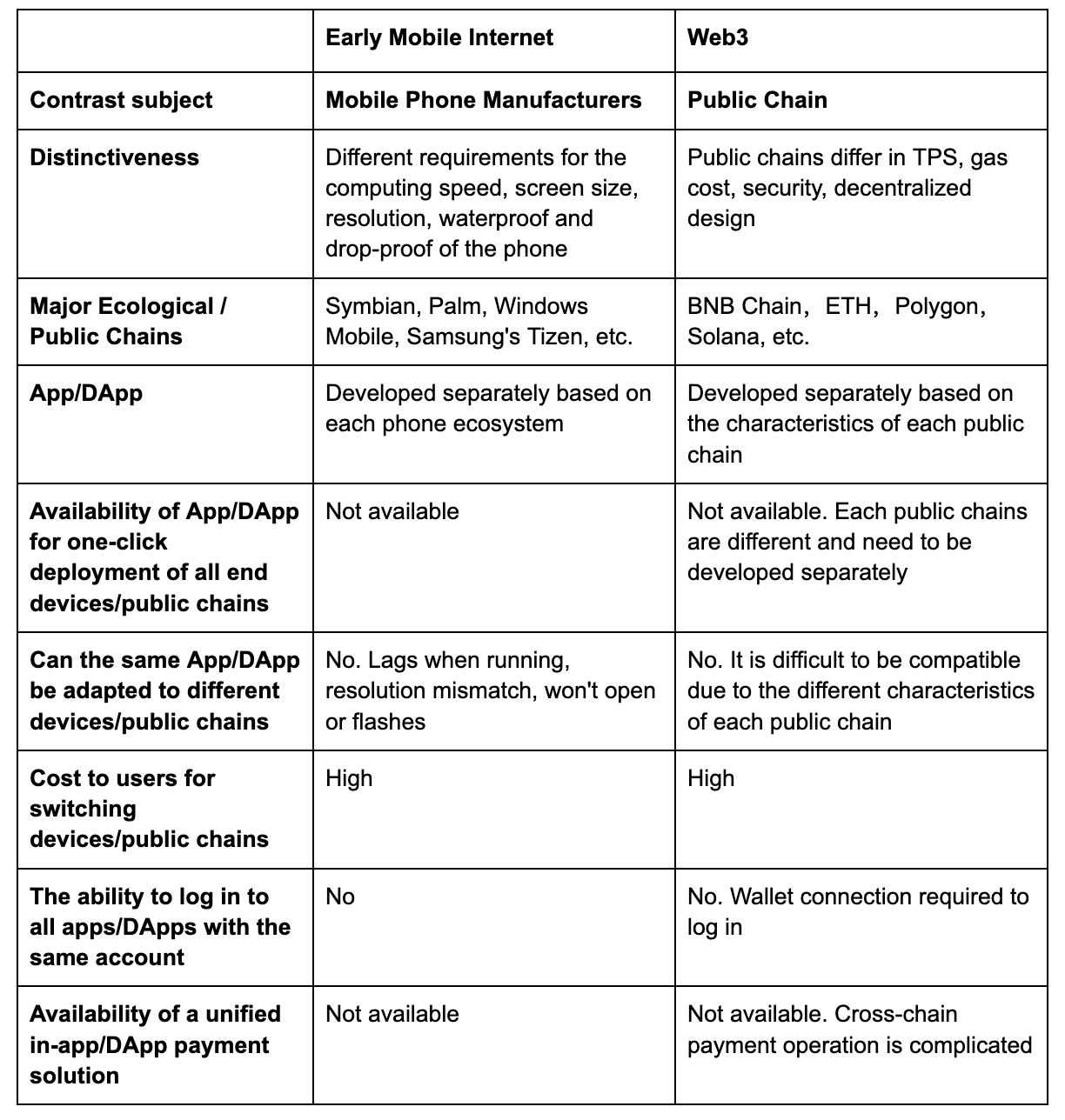 In the early days of the mobile internet era before the advent of the Android system, phone manufacturers experienced similar difficulties to those faced by today's major public chains in many ways. A comparison of the details is presented in the following table: