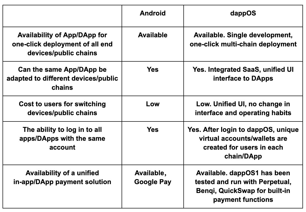 The Android system played a crucial role in the development of mobile internet. In Web3, Android system means DApps can run on Web3's unified operating system and infrastructure. By comparing the solution of Android system and dappOS to ecological issues, it can be seen that dappOS's technical approach to improving user experience, supporting developers, and building a unified payment system within DApps is very similar to the functions of Android system in Web2.