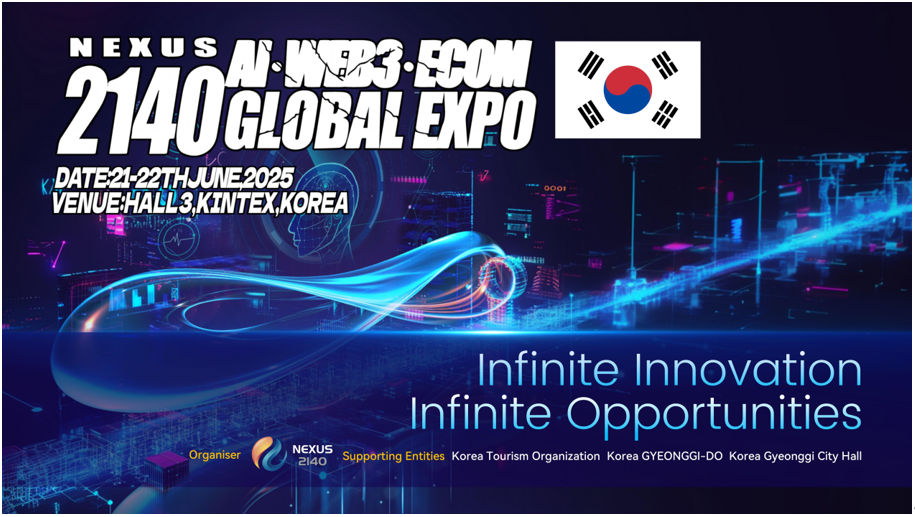 The highly anticipated Nexus 2140: AI · Web3 · ECOM Global Expo will take place on June 21-22, 2025, at the KINTEX Convention Center in Goyang, South Korea. Organized by Nexus 2140 and supported by the Korea Tourism Organization, Gyeonggi Provincial Government, and Goyang City Government,This event will unite global tech leaders, investors, industry leaders, and emerging brands to explore synergies and future opportunities across AI, Web3, and e-commerce.