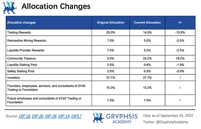 dYdX V4 has made careful improvements to its economic model. The total supply of $DYDX tokens is set at 1 billion, and starting from August 2021, these tokens will gradually unlock over a period of five years. However, with adjustments through several governance proposals (such as DIP 14, DIP 16, DIP 17, DIP 24), there have been significant changes in the initial token allocation.