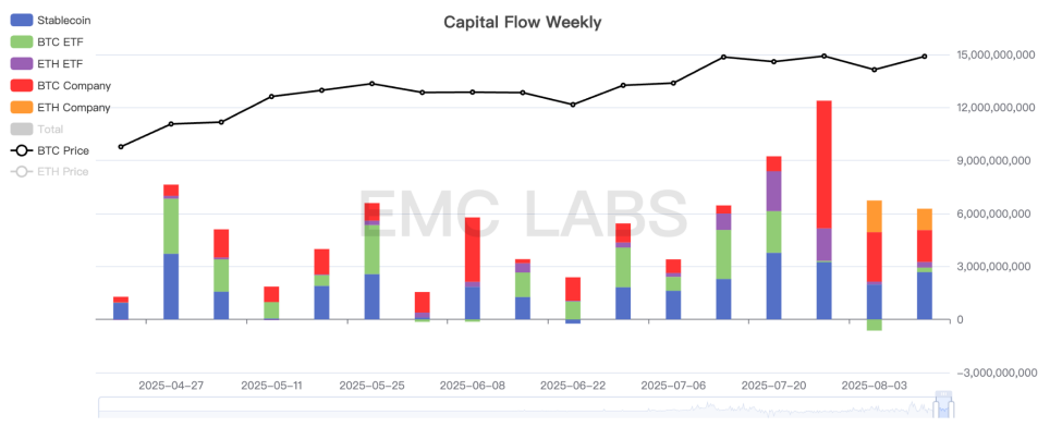 This week, the total market capital inflow reached US$6.172 billion, slightly higher than last week's US$6.104 billion, of which 2.582 billion was from the stablecoin channel, 257 million was from the BTC Spot ETF channel, 1.807 billion was purchased by BTC companies, 321 million was from the ETH Spot ETF channel, and 1.206 billion was purchased by ETH companies.
