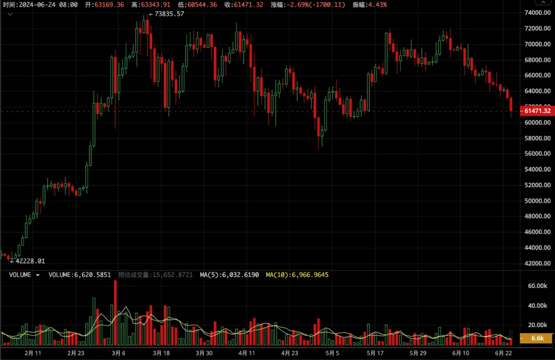 BTC continued to adjust downward in the short term, and as of June 24, it once fell below $61,000. Last week, we predicted that the market would enter a short-term clearing phase of weak equilibrium, and the first target of clearing would be Bitcoin miners. As the price of the currency fell, more and more miners sold all their daily output (maximum supply 450 coins/ day) and also sold their solid inventory.