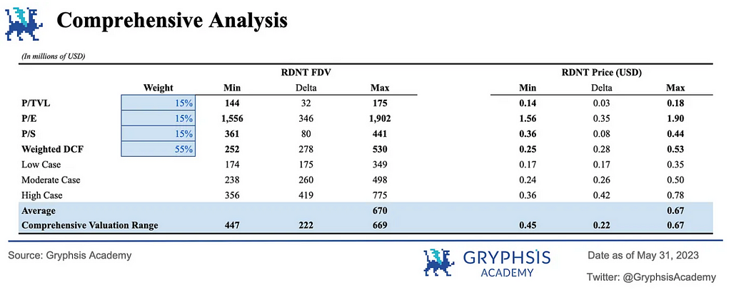 We performed a sensitivity analysis to establish a range of valuation outcomes. Using P/TVL, P/E and P/S ratios, the comparative analysis produced three different values. We selected the minimum and maximum values from the sensitivity analysis with varying terminal P/E ratios and discount rates for the probability-weighted DCF valuation. Allocating weight for multiples at 15% each and 55% for the weighted DCF, our comprehensive analysis proposes a price range of $0.45 to $0.67 for $RDNT.To conclude, Radiant’s impressive performance in cross-chain lending is notable. Still, its heavy reliance on Stargate and LayerZero for cross-chain features could limit its growth. Even though challenges exit, its future appears bright. Radiant Capital can continue its evolution by implementing robust risk management frameworks, incorporating new assets, and partnering with other DeFi protocols.
