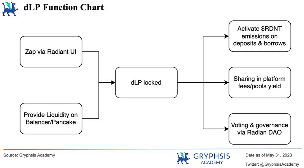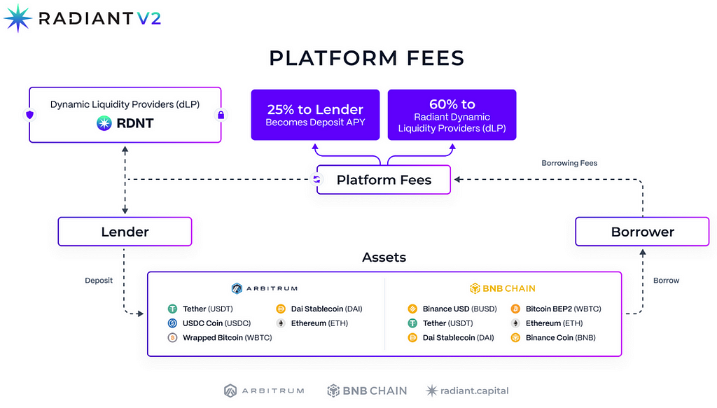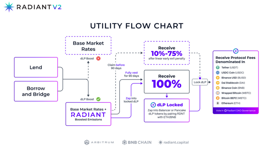 2. Liquidity Mining: Radiant investors can earn from locking and vesting $RDNT tokens. Dynamic Liquidity Providers (dLPs) are $RDNT liquidity-providing tokens. Pairs available are an 80/20 (RDNT/ETH) composition on Arbitrum and 50/50 (RDNT/BNB) on BSC. Users can withdraw locked dLPs or use them as collateral. They capture platform fees from borrowers, flash loans, and liquidation. A minimum of 5% $RDNT lock relative to USD deposit size qualifies users to earn $RDNT emission on borrows and deposits. An early exit fee applies to the vesting period (recently extended to 90 days).