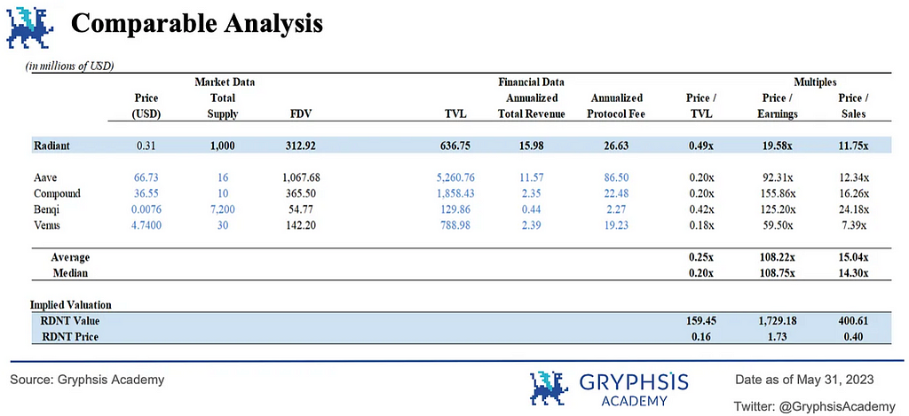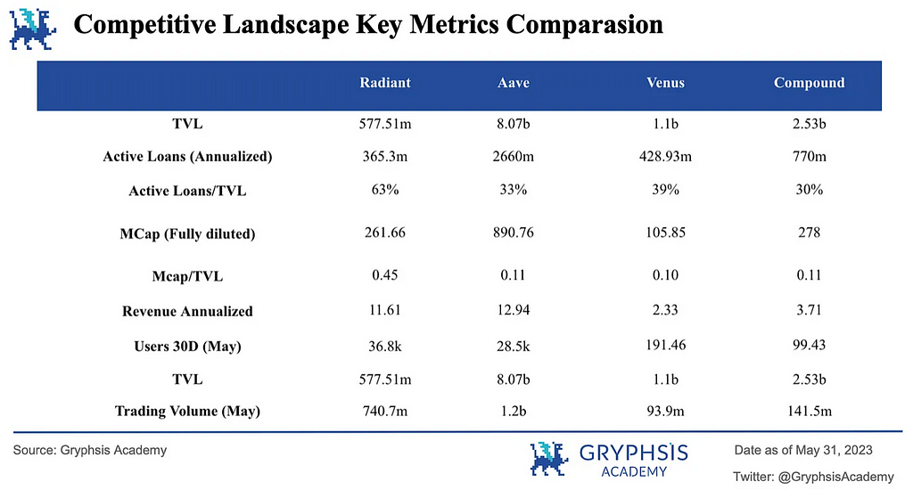 A comparative analysis places Radiant’s total value locked (TVL) at $636.75 million, positioning it between Benqi and Venus in terms of capital locked within the protocol. With a fully diluted valuation of $312.92 million, Radiant is smaller than Aave and Compound but larger than Benqi and Venus.