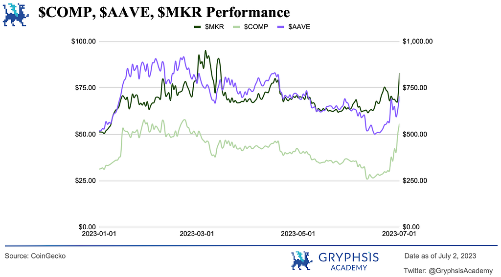 Superstate’s operation is still on hold pending regulatory approval. Yet, $COMP has already surged over 30% following the news. As it remains uncertain whether Superstate will issue its native token, the buying spree could be fuelled by speculation that $COMP might reap some benefits. Consequently, $COMP has outperformed the other two veteran DeFi blue-chips, $MKR and $AAVE, in recent weeks.