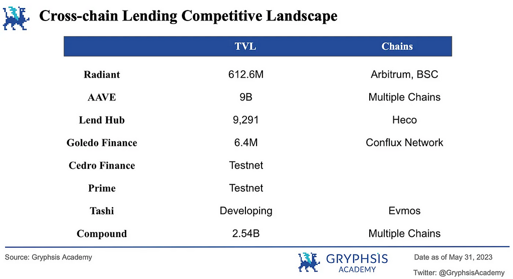 Being the first omni-chain lending & flash loan protocol built atop Layer Zero, Radiant leads the cross-chain lending space, a less competitive yet potentially profitable domain. Radiant’s ability to allow users to deposit collateral on one chain and borrow against it on another sets it apart. This is possible via Stargate’s cross-chain router, enabling asset deposits on Arbitrum and borrowing on any Stargate-supported EVM chain. This scalability enhances asset utilization and addresses the liquidity fragmentation issue prominent in other protocols like AAVE.