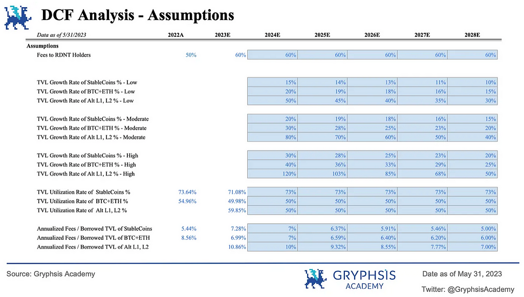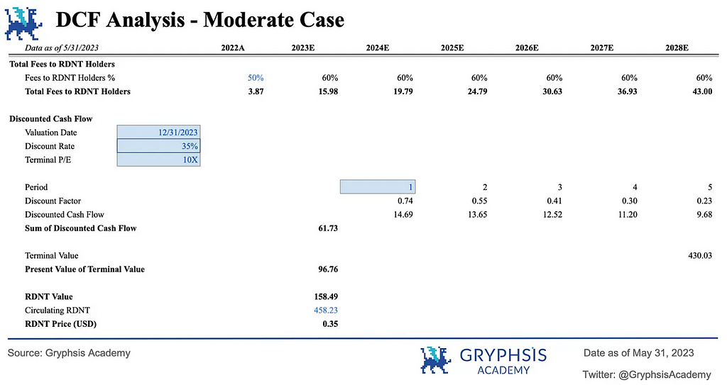 The moderate scenario of our DCF analysis predicts an RDNT price of $0.35 and a valuation of $158.49 million on Dec 31, 2023. Applying probability weights to our low, high, and moderate cases (25%, 25%, and 50%, respectively), we find a probability-weighted DCF valuation for the RDNT price at $0.37 and a protocol valuation of $168.14 million. Comparing this to the RDNT price on 31/05/2023 of $0.31, we forecast a potential upside of 17.26%.