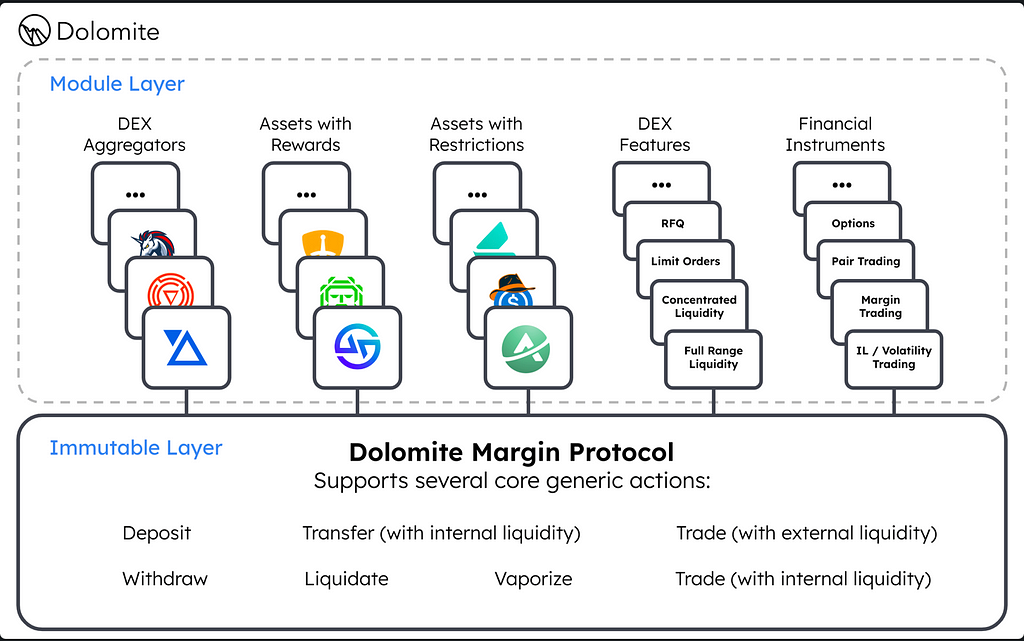 Dolomite boasts a modular architecture composed of two layers: the core (immutable) and module (mutable) layers. This design reflects the spirit of DeFi, pairing an immutable base with a flexible layer that adapts to the ever-evolving trends and paradigms of the DeFi space. A key feature of Dolomite is its virtual liquidity system, which promotes capital efficiency by allowing liquidity to be recycled or reused for multiple sources of yield.