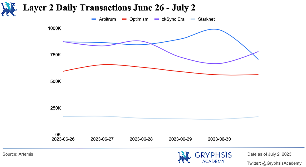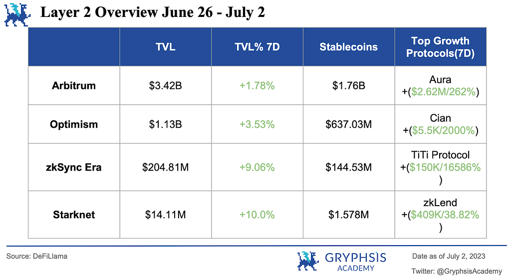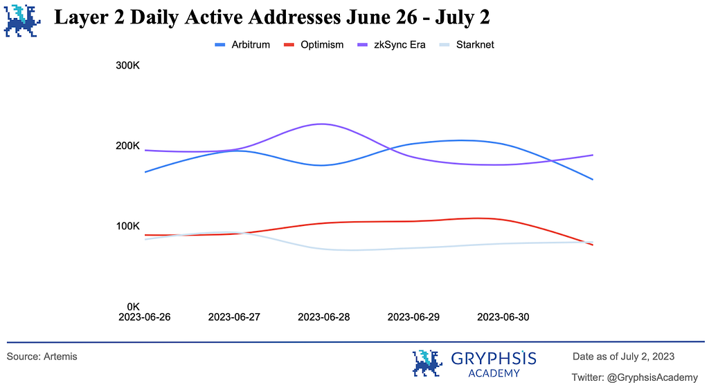 This week saw all four Layer-2 solutions exhibit modest growth in TVL, led by zkSync, which recorded a growth of 9%. Individual protocols such as Cian, Aura, TiTi, and zkLend distinguished themselves, boasting the most substantial TVL growth over the past week. Additionally, both Arbitrum and zkSync experienced a slight uptick in their daily active addresses compared to the previous week. As a result, Arbitrum and zkSync Era continue to be at the forefront of Layer-2 solutions.