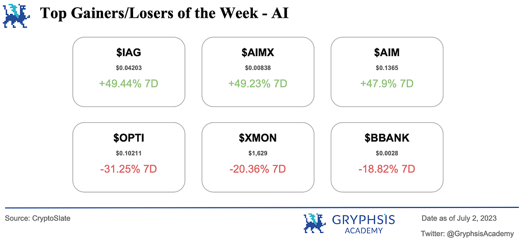 The AI sector has faced a bit of a downturn this week, with the sector’s total market capitalization witnessing a dip of approximately 3.5%. In a surprising twist of fate, $OPTI, one of last week’s standout performers, found itself among the top losers this week with a significant drop in its price by around 30%. However, not all was gloom and doom in the sector, as $IAG shone brightly. For the second week running, $IAG held its position as one of the top gainers in the AI sector, surging by almost six-fold over the past fortnight.