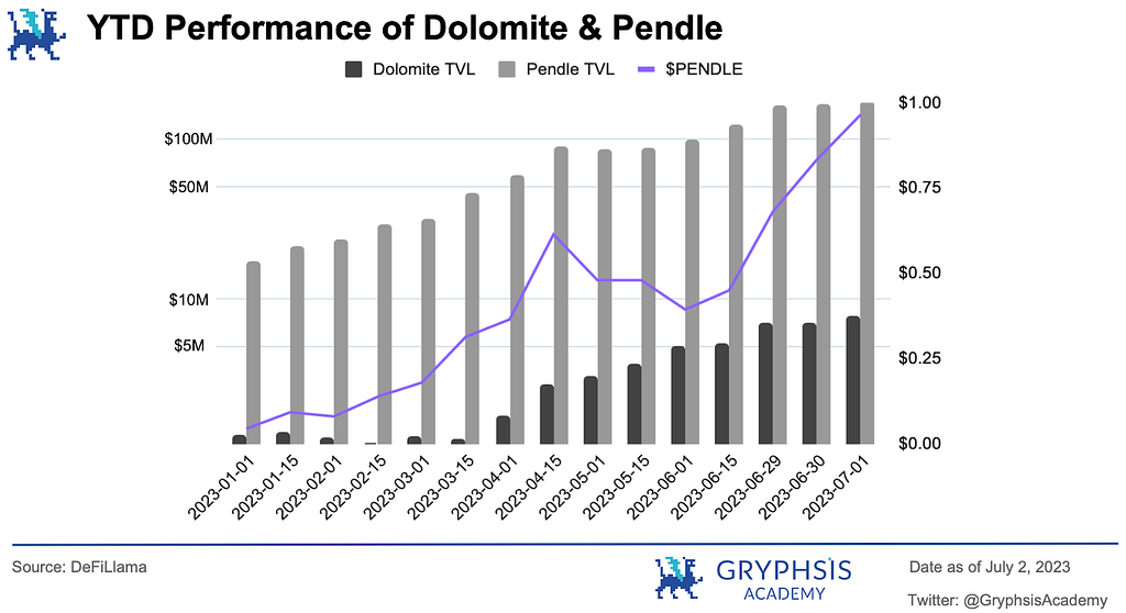 Dolomite’s inaugural use of PT-GLP as collateral marks the first instance of Pendle assets serving as collateral — a landmark for both protocols. Since 2023, Pendle Finance has seen considerable growth in TVL and token price — multiplying ten and eighteen times, respectively. This growth is largely due to Pendle’s unique product and the rise of the LSD narrative, unlocking new yield opportunities and illustrating true product-market fit. Simultaneously, Dolomite has seen a fivefold increase in TVL since 2023.