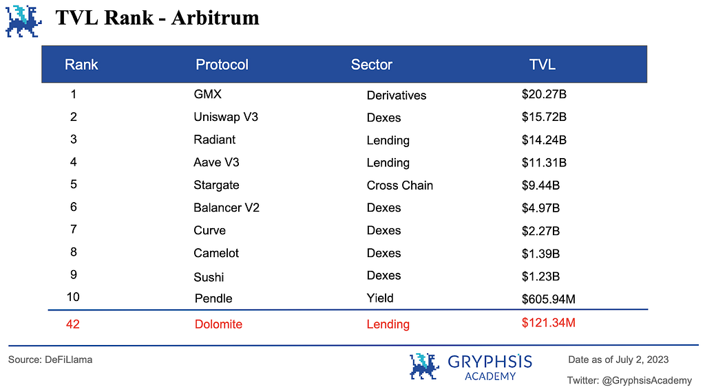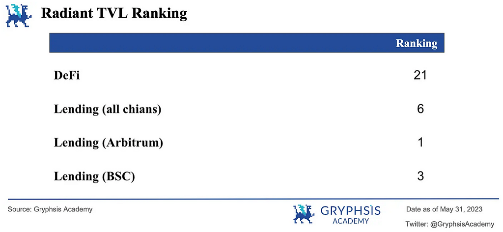 Radiant leads on the Arbitrum chain with a high TVL. The borrowing TVL is relatively higher than its peers, possibly due to the easy-to-use lock & loop feature and attractive incentives. However, its MCap/TVL ratios are higher than its peers, indicating a slightly higher valuation at present.