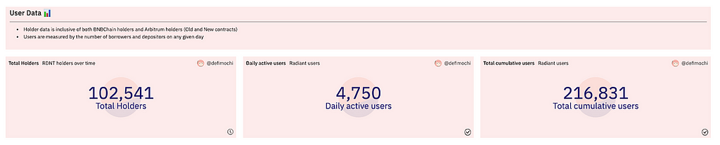 Since the launch of V1, Radiant saw two waves of user surges in Q3 2022 and January 2023, although user numbers didn’t significantly rise after the Radiant V2 launch. Currently, there are 216,831 cumulative users, with 4,750 daily active users.