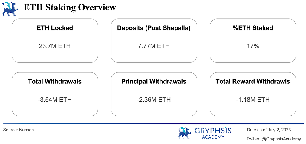 The LSD sector has continued to display consistent growth this week. Notably, deposit volumes have experienced a slight increase, adding to the overall expansion of the sector. The percentage of ETH staked has remained stable at 17%, identical to last week’s figure.