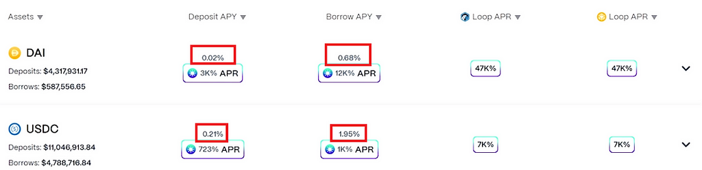 This asset availability fuels borrowing, lending, and trading within the ecosystem. Radiant provides two rates: the red rate is the market APY for lending/borrowing underlying assets, and the purple APR refers to the native utility token $RDNT rewards for platform interaction and liquidity provision. High borrowing rates are currently offset by substantial $RDNT rewards, attracting a large user base.