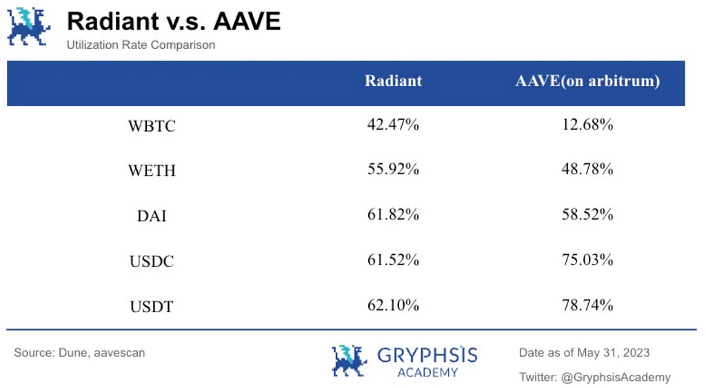 The overall utilization rate of around 60% is relatively higher than its peers, with $RDNT emission incentives and the easy-to-use loop & lock feature increasing the asset utilization rate. While Radiant’s utilization rate in stablecoins matches AAVE, it outperforms in utilization rates with WBTC and WETH.
