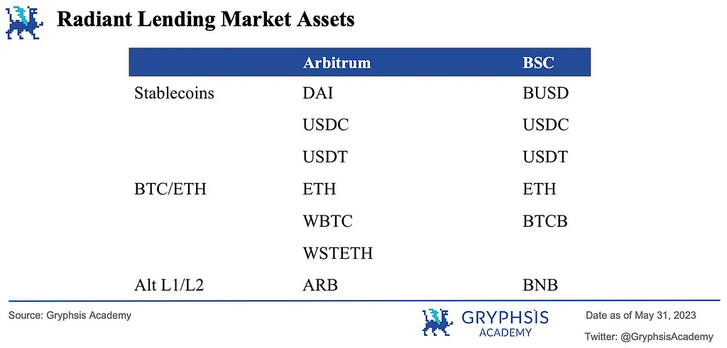 The Radiant Lending Market operates on both Arbitrum and BSC, supporting a broad range of assets including stablecoins (e.g., DAI, USDC, USDT) and popular crypto assets (ETH, WBTC, WSTETH, and ARB on Arbitrum; ETH, BTCB, and BNB on BSC).