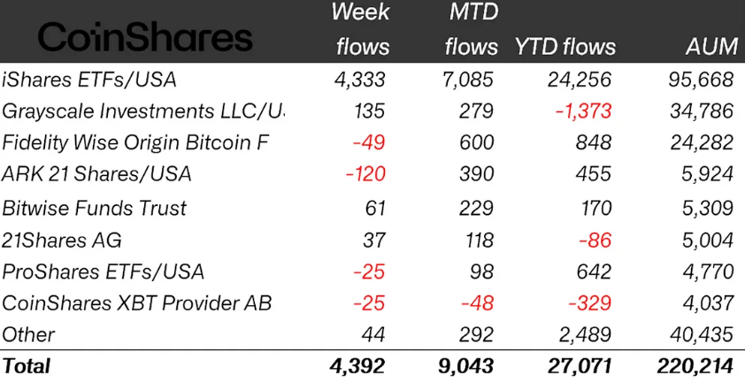 With the fresh gains, the year-to-date (YTD) inflows in crypto ETPs climbed to a new high of $27 billion, while total assets under management (AUM) for the first time broke $220 billion.