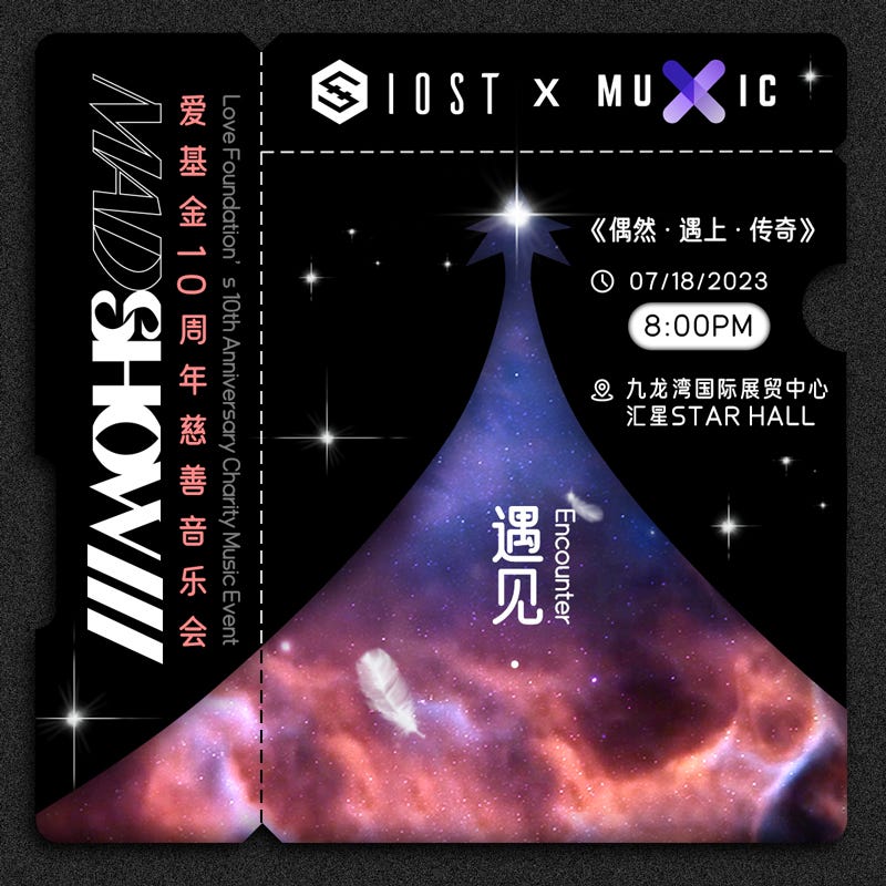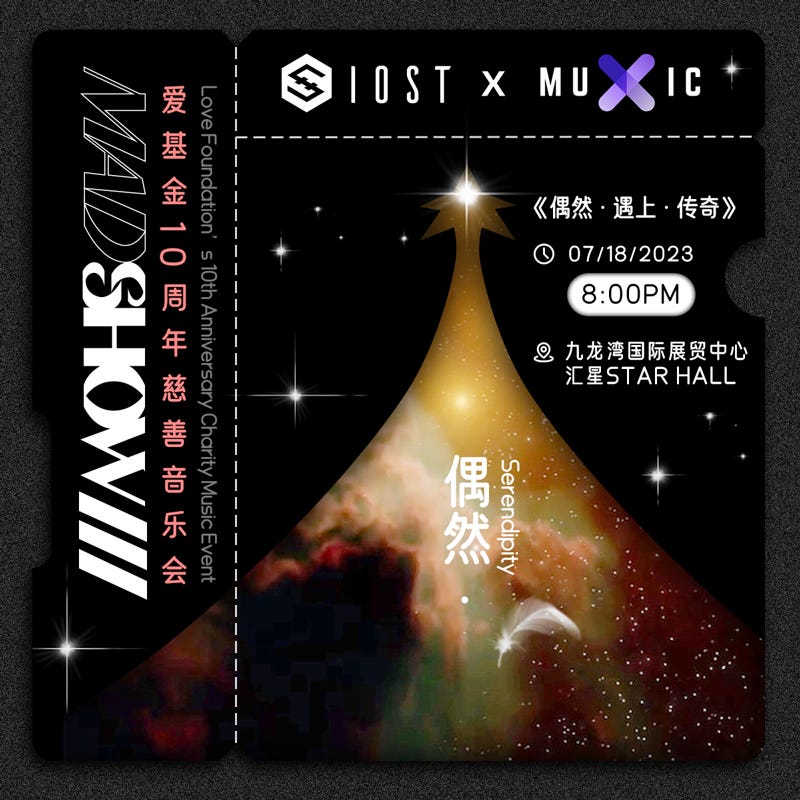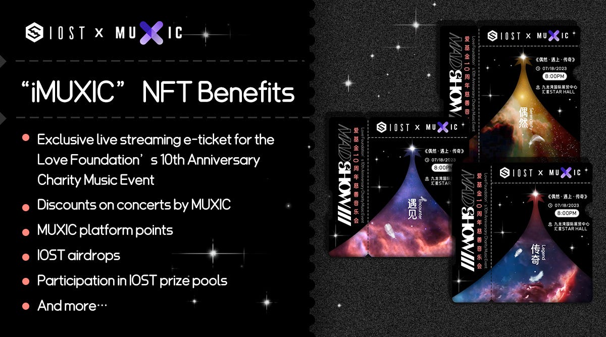 In May 2023, IOST announced a strategic partnership with MUXIC, the Hong Kong metaverse music platform, with MUXIC becoming an official IOST partner node. On July 18th, IOST and MUXIC will collaborate to host Love Foundation’s 10th Anniversary Charity Music Event at the STAR HALL in Kowloon Bay International Trade & Exhibition Centre, Hong Kong. During this occasion, IOST will issue a novel concept of blockchain-based NFT tickets, namely “iMUXIC,” granting exclusive access to holders of these digital items. With the iMUXIC NFT, you can participate in the event through both online and offline channels and watch the live broadcast of the “Serendipity · Encounters · Legends” concert.