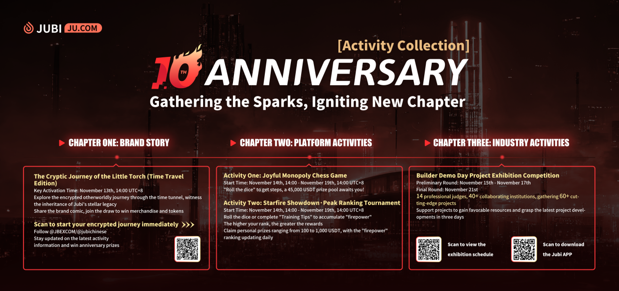 On the occasion of our tenth-anniversary celebration, to bring more warmth to our users and provide additional support to projects, Jubi is carrying out a series of activities under the theme of 'Gathering the Sparks, Igniting New Chapter.' For platform users, we are launching the 'Joyful Monopoly' and 'Starfire Showdown·Peak Ranking Tournament' events, with a free distribution of a USDT prize pool of 50,000, available to claim by playing games. For industry partners, we are initiating and hosting the Builder Demo Day Project Exhibition, assembling 14 professional judges, collaborating with 40+ top-tier institutions, and showcasing 60+ market emerging projects. Our aim is to create a high-quality exhibition platform for early-stage projects in the market, leveraging the platform's strength to provide opportunities for high-quality projects from various domains, connecting them directly with capital and users, and assisting projects in overcoming the challenges of the winter season.