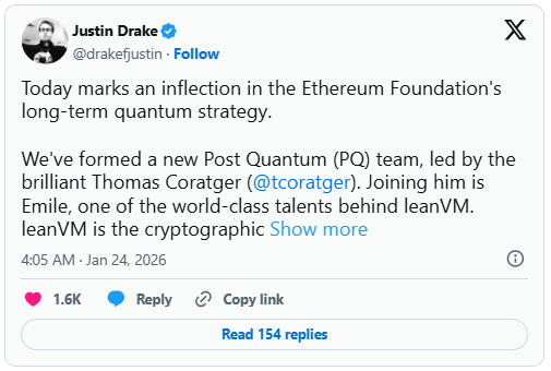 Drake outlined several near term steps. A bi weekly developer session focused on post quantum transactions is expected to start next month, led by Antonio Sanso. The agenda is aimed at user facing defenses, including dedicated cryptographic tools inside the protocol, account abstraction paths and longer term work on aggregating transaction signatures using leanVM.