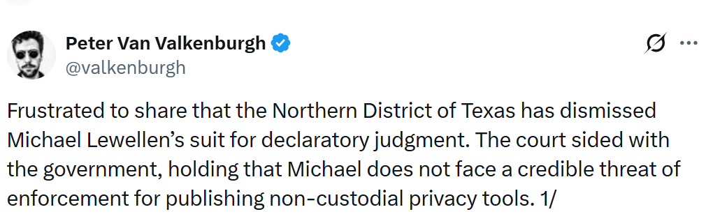 Peter Van Valkenburgh, the executive director at Coin Center, said the memo cited by Judge O’Connor “has not provided meaningful protection to developers, given the outcomes in the Tornado Cash and Samourai Wallet cases.”