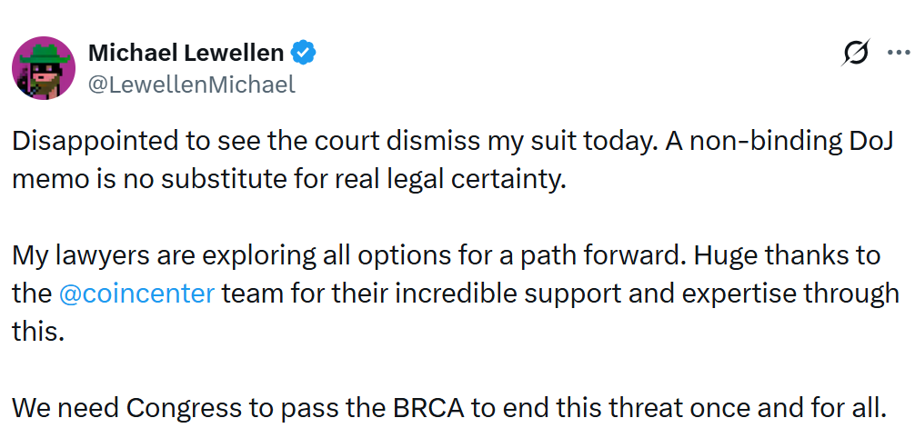 “Disappointed to see the court dismiss my suit today,” said Lewellen on X on Wednesday.