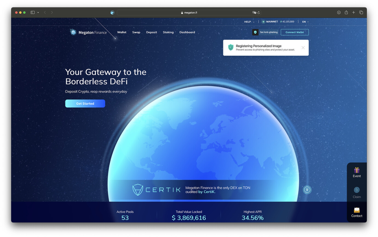 Megaton, a decentralized exchange (DEX) based on AMM technology and is based on TON. It was established by the Korean development team Ozys in December 2022. Following its official launch, Megaton embarked on a series of liquidity incentive activities to attract users and enhance its market position. This strategic approach has paid off, as evidenced by its ranking on DefiLama’s data dashboard. Megaton currently holds the third position in terms of Total Value Locked (TVL) on TON, boasting over $3 million in assets.