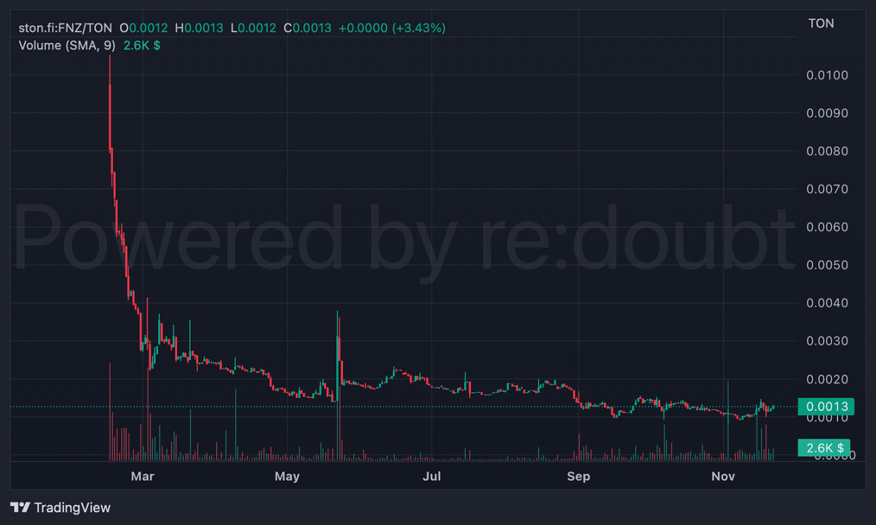 As the first IDO project on TON, Fanzee garnered high expectations from users, and its fundraising campaign proved quite successful. However, following its listing on the exchange, the $FNZ price suffered a huge setback. This downturn could be attributed to insufficient platform use cases to sustain a high market value or the overall bearish trend in the cryptocurrency market. Currently, $FNZ has seen a nearly 90% drop in value in less than two years, from its initial public fundraising price of $0.02 to $0.0025.