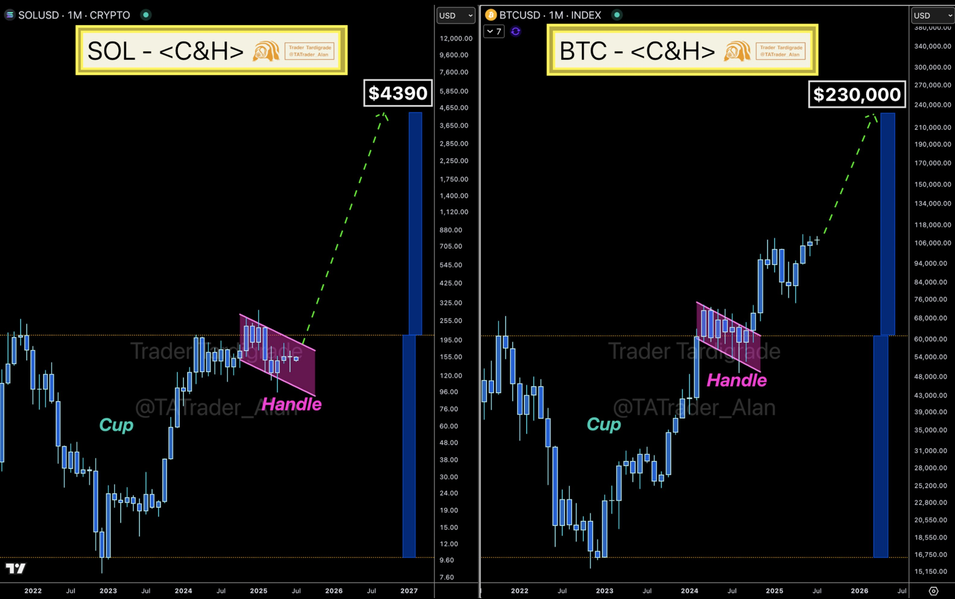 “This pattern sets $BTC and $SOL to targets of $230,000 and $4,390 respectively.”