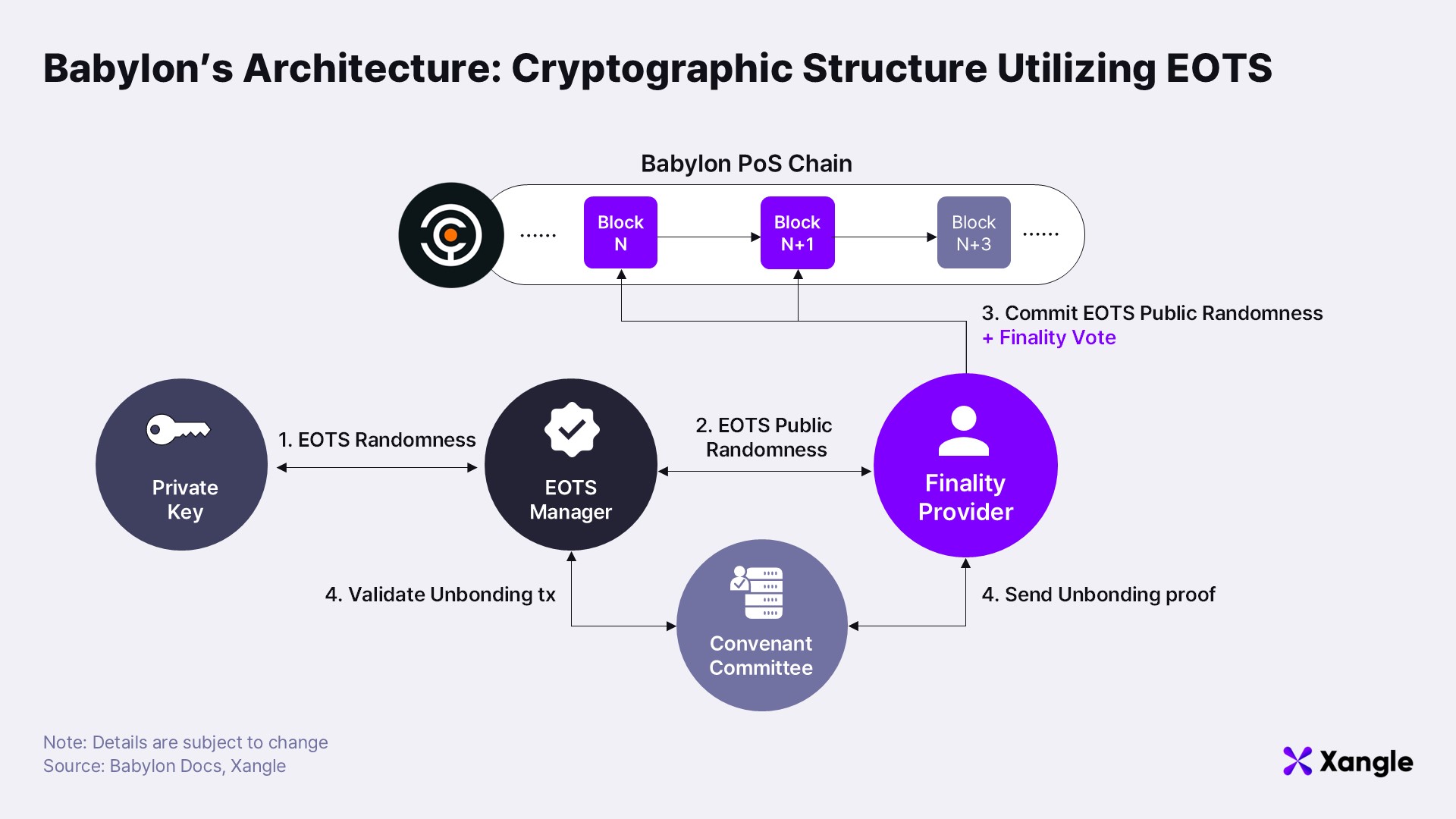The EOTS mechanism within the Babylon protocol operates as follows: