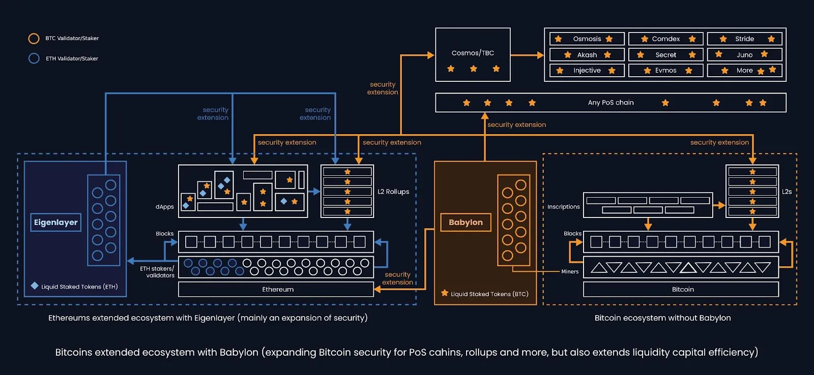 Babylon has created a new use case within the Bitcoin ecosystem—Bitcoin Staking. The primary goal is to establish a security economic structure that not only reinforces the security of other PoS chains through staked Bitcoin secured by PoW but also provides additional economic incentives. If successfully launched and commercialized, Bitcoin will evolve beyond being merely a store of value, becoming a multifaceted asset with various utilities.