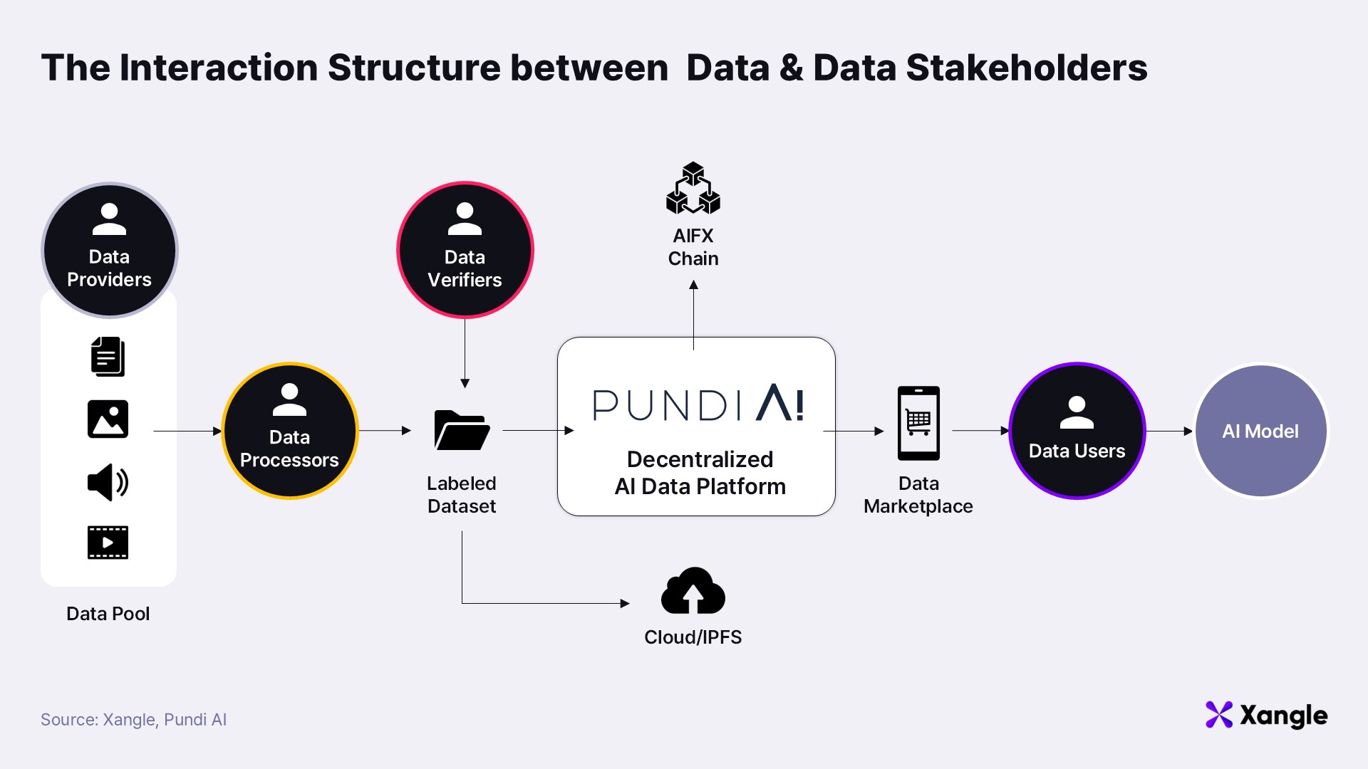 The Pundi AI platform is a decentralized data platform comprising various stakeholders in the AI data ecosystem—data providers, processors, validators, and users. This ecosystem enables transparent and fair management of data throughout the entire process, from creation to utilization, through interaction among participants and data.