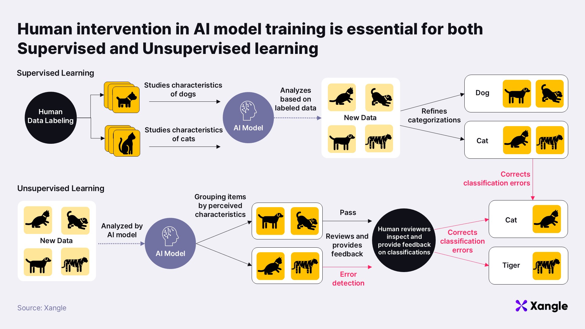Despite these advancements, human involvement remains essential in the data pipeline. AI model training generally follows one of two approaches: supervised or unsupervised learning. Both require human oversight to ensure data accuracy and relevance. In supervised learning, labeled datasets created through human classification are indispensable; inaccurate labeling can lead to flawed model outcomes. In unsupervised learning, human judgment is required to evaluate and validate AI-generated classifications. Ultimately, regardless of the training approach, human intuition and expertise are essential to ensure data accurately represents useful information. Given that data quality is key to AI model performance, the role of humans in data creation remains vital.