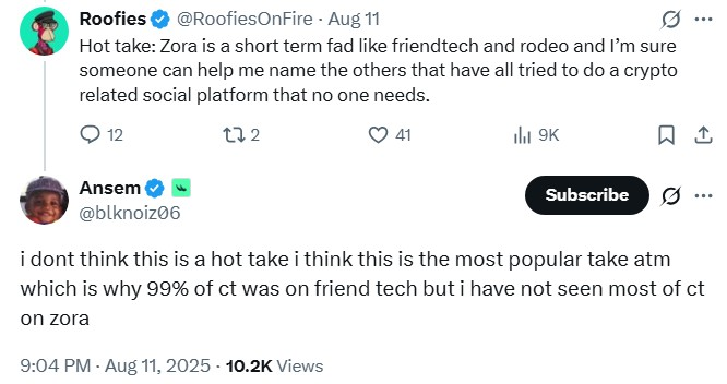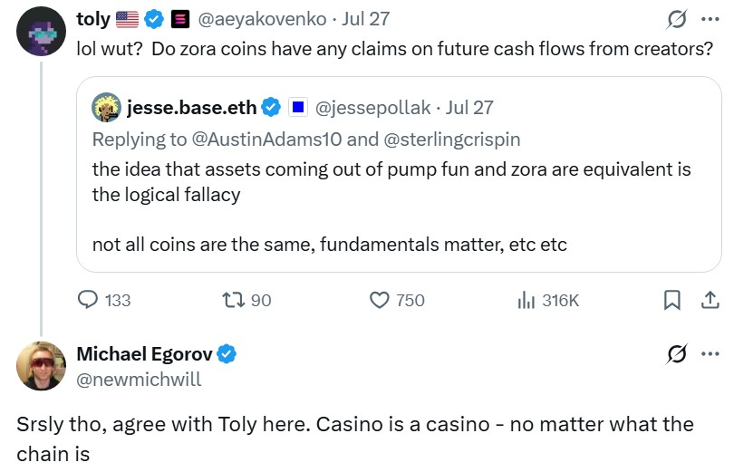 Alexander Cutler, CEO of Aerodrome — a decentralized exchange on Base — publicly defended Zora. He argued that heavy Instagram users are drawn to Zora, as they get rewarded for their usual activities.