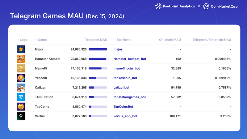 Most critically, sustained on-chain engagement emerged as a fundamental concern. This was particularly evident in Telegram games’ performance: Hamster Kombat’s MAU dropped from over 100 million in September to 22.9 million by mid-December, with only 0.0004% of users engaging in on-chain gaming activities. While other Telegram games showed higher conversion rates, most remained below 1%. It’s worth noting that these metrics specifically reflect on-chain gaming activities, as most Telegram games’ core gameplay remains off-chain, with users potentially more active in other sectors like memecoins or DeFi. This highlights the persistent challenge of converting platform users into active blockchain gamers.