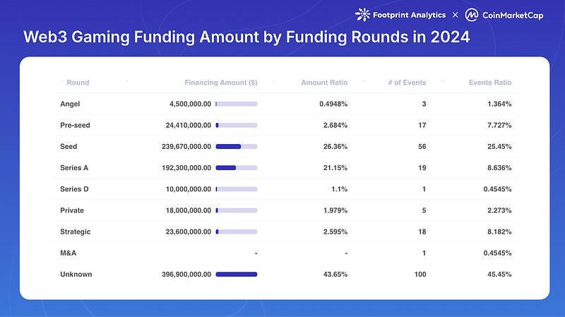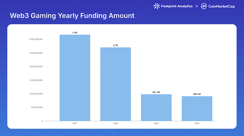 Web3 gaming secured $909.4 million across 220 funding events in 2024. While funding amount decreased 7.3% from 2023 and remained significantly below the 2021–2022 boom period ($3.2 billion and $2.7 billion, respectively), the number of funding events increased 48.7% from 2023, indicating continued investor interest. despite smaller deal sizes.