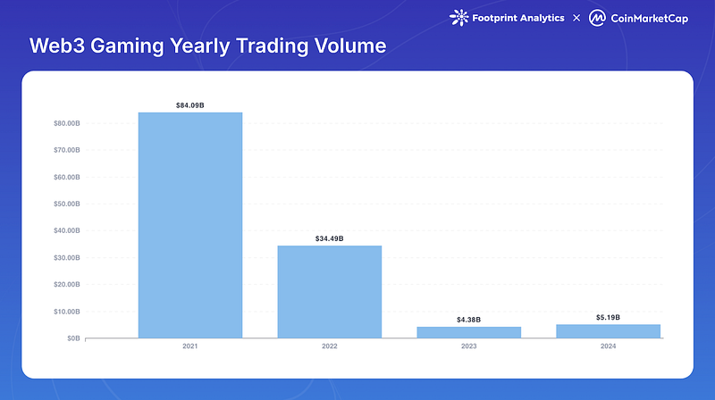 The total trading volume of Web3 gaming in 2024 reached $5.2 billion, representing an 18.5% increase from 2023’s figure. While this reversed the downward trend since 2021, volume remained significantly below previous cycle highs. The 2024 figure represented only 6.2% of 2021’s peak ($84.1 billion) and 15.1% of 2022’s volume ($34.5 billion).