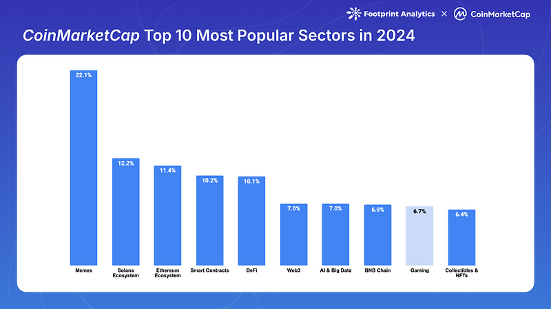 Despite the broader crypto market’s strong performance in the latter half of 2024, particularly during the Bitcoin-led rally in the final two months, gaming tokens lagged behind other sectors. CoinMarketCap data shows Web3 gaming ranked 8th among the Top 10 Sectors in market cap growth, significantly trailing behind the leading sectors: Memes (421.1%), AI & Big Data (168.0%), and Solana Ecosystem (124.1%).