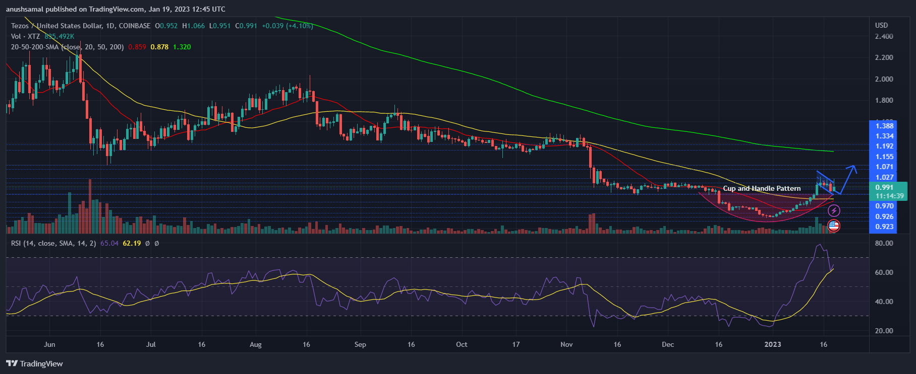 XTZ was trading at $0.99 at the time of writing. Although the coin started to retrace over the 48 hours, it has regained bullish momentum on the chart. The altcoin has formed a prominent cup-and-handle trading pattern, which is an extension of bullish momentum.