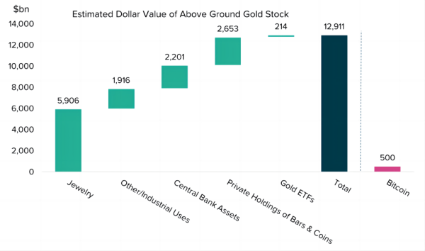 Exhibit 1: Bitcoin still small compared to investment gold market