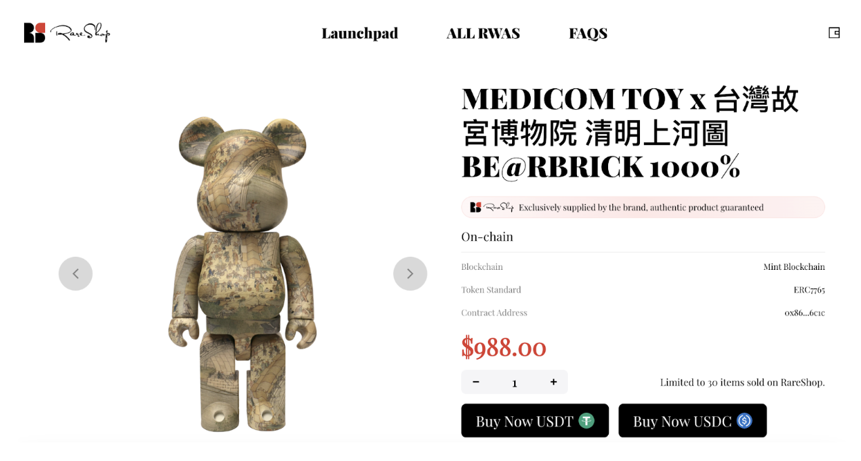 RareShop is the world's first consumer-facing RWA NFT product launch platform. It utilizes an innovative asset protocol—ERC-7765—to support large-scale adoption of RWA NFTs. RareShop not only enables on-chain ownership and trading, but also offers rich interactive scenarios, including crypto payments, privacy protection, product pre-sales, gifting, and physical delivery. With Mint Blockchain as its technical foundation, RareShop provides global brands and enterprises with comprehensive Web3 digitization solutions—accelerating the Web3 transformation of the real economy.