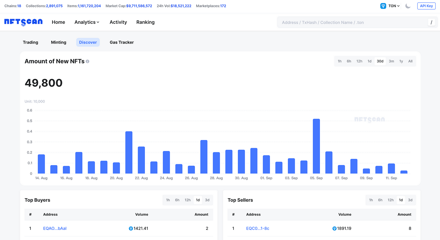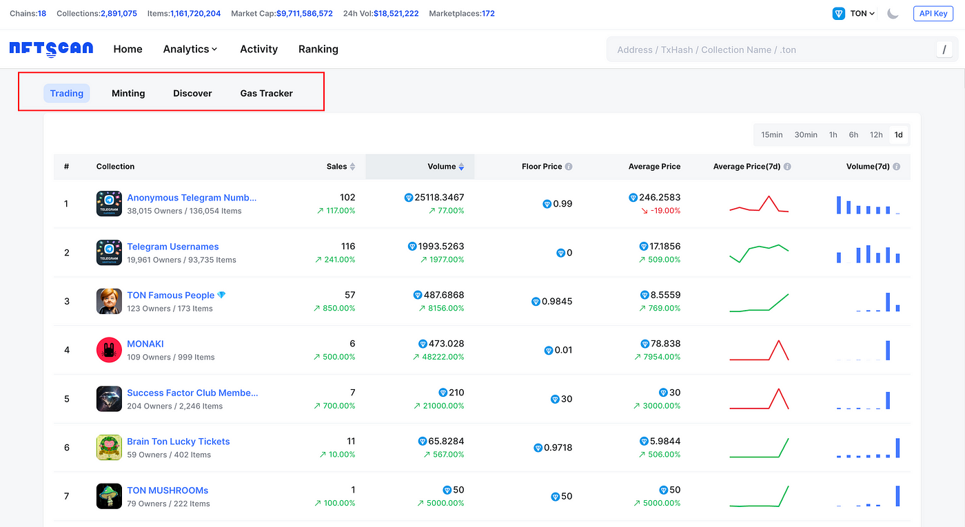 The TON NFT data analysis section on TON NFTScan Explorer includes Trading, Minting, Gas Tracker, Ranking, and more. Through TON NFTScan Explorer, users can view detailed information and on-chain data of any NFT asset issued on the TON network. They can also query NFT asset data and transaction history for any wallet address.