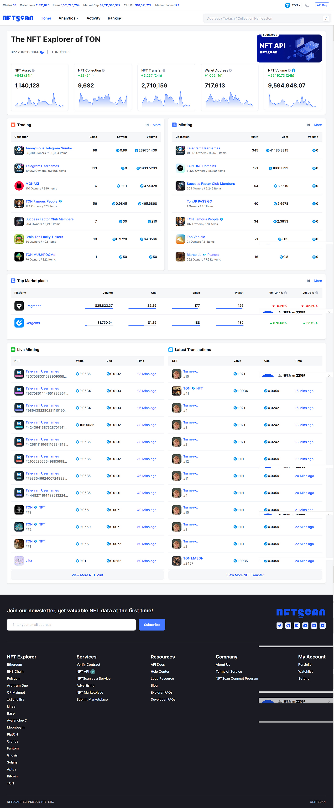 Through the TON NFTScan browser, users can view real-time on-chain block NFT data analysis and NFT Analytics data analysis, and query the details and on-chain data of any NFT asset issued on the TON network; You can also query the NFT asset data and history held in any wallet address.