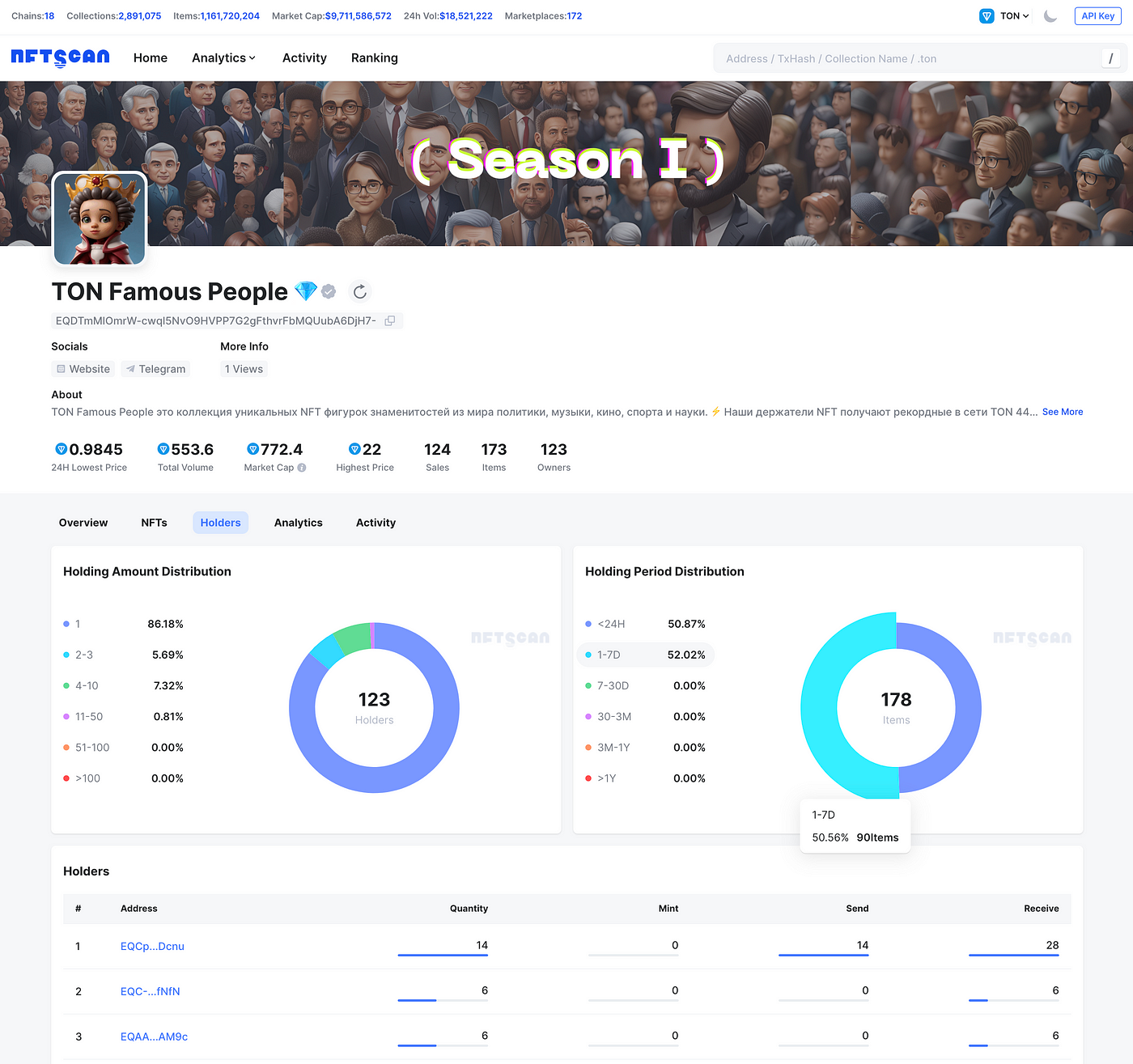 NFTScan is the global leading multi-chain NFT data infrastructure service provider, and TON network is the 18th blockchain supported by NFTScan, following Ethereum, Bitcoin, BNBChain, Polygon, Solana, Avalanche, Arbitrum, Optimism, Aptos, Fantom, Gnosis, Cronos, Moonbeam, Platon, Linea, zkSync Era, and Base.